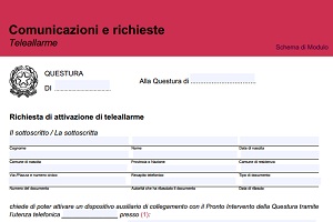 Riportiamo il comodo modulo messo a disposizione dalla Polizia di Stato italiana per richiedere l’attivazione di un teleallarme dopo l’installazione presso la propria abitazione (o altro edificio) di un sistema di antifurto a combinatore telefonico. Ricordiamo che l’attivazione del teleallarme in seguito alla presentazione del modulo avviene a titolo completamente gratuito.