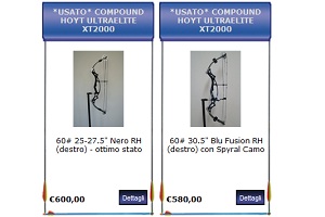 La sezione si divide nelle sottocategorie Usati Olimpici, Usati Compound, Usati Tradizionali e Usati Accessori. Le offerte variano col tempo, ma in questo momento, per esempio, nella categoria archi olimpici sono disponibili un gran numero di flettenti Hoyt, Green Horn, Exe, Kaya, Kap Challenger e Samick, nonché alcuni riser Hoyt e Samick. Tanti archi usati nella sezione Compund, dall’Elite Archery XLR all’Hoyt Contender Elite XT 2000, dal Mathews Apex 7 al Compound PSE Mojo. Non mancano inoltre archi tradizionali Samick, Longhorn, Caribow Taiga e Longbow Gabbiano.