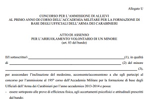 Riportiamo, tra i tanti moduli necessari per partecipare al concorso per l’accesso alle Accademie militari del 2013, l’atto di assenso all’arruolamento per tutti coloro che vogliono tentare di entrare nell’accademia per la formazione di base degli ufficiali dei Carabinieri.