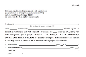 Presentiamo qui in basso il modulo scaricabile e pronto da stampare relativo alla dichiarazione di mantenimento dei requisiti necessari per l’arruolamento come messo a disposizione dalla Marina Militare italiana per tutti coloro che vogliono candidarsi come VFP1 nel corso del 2013.